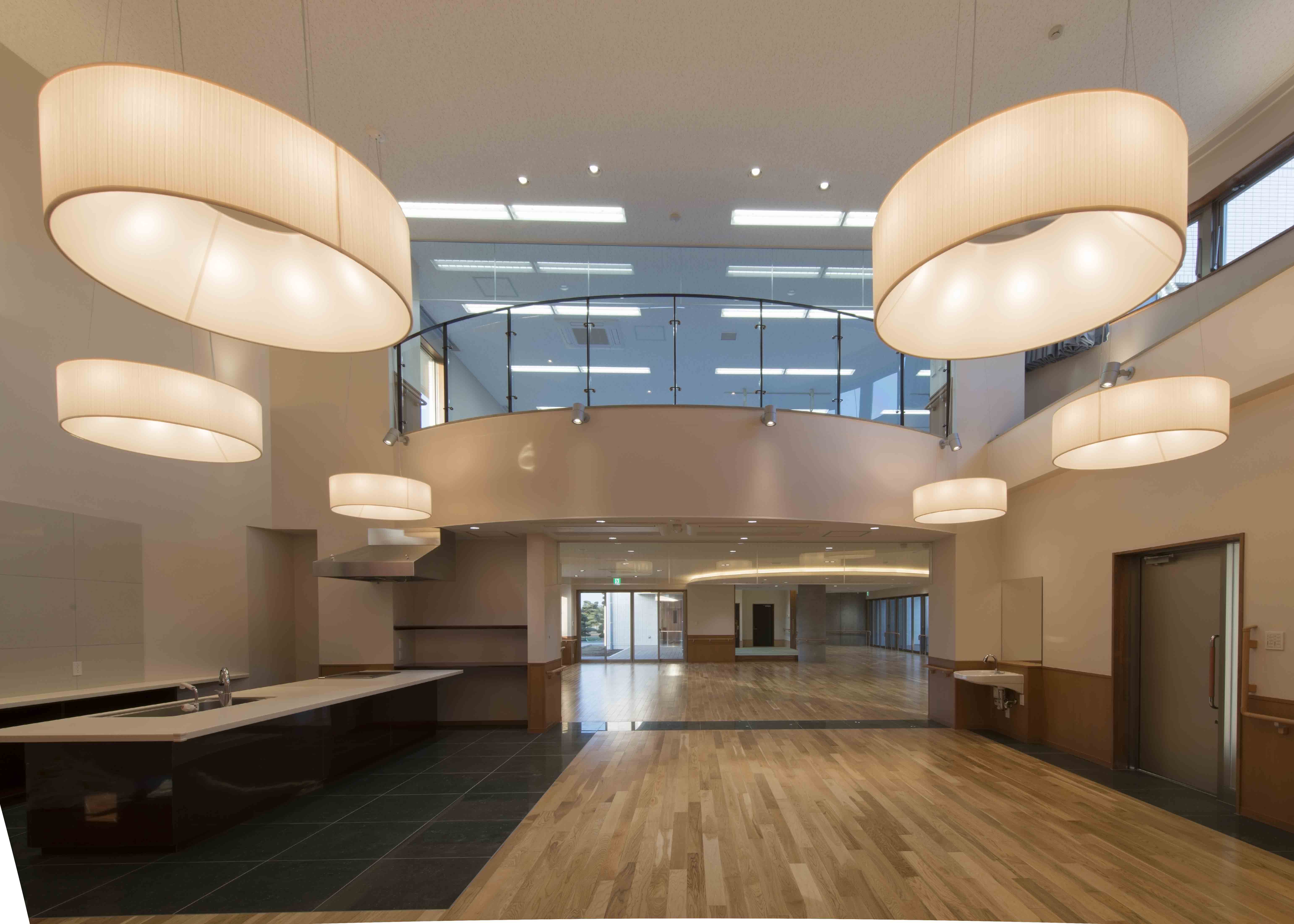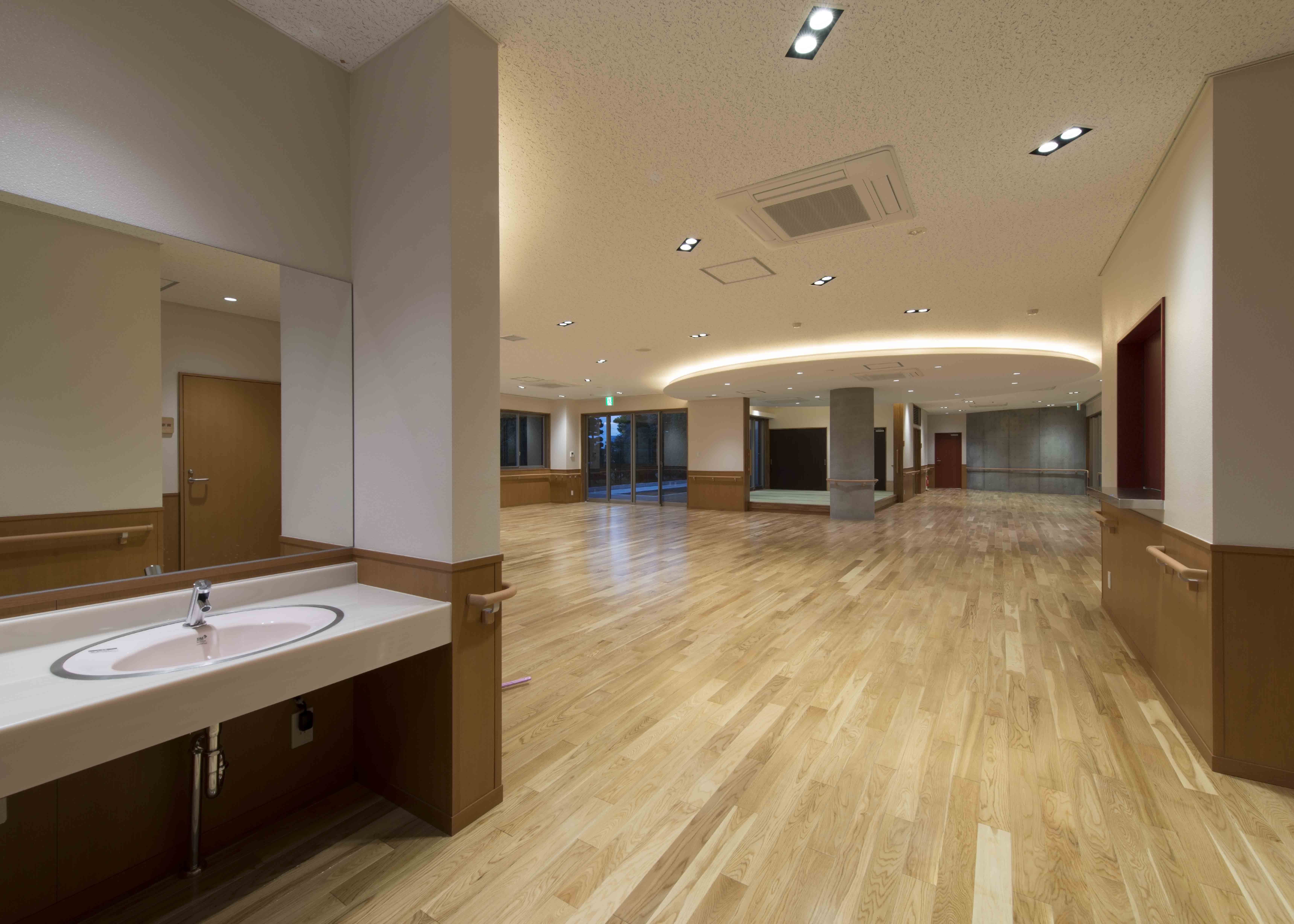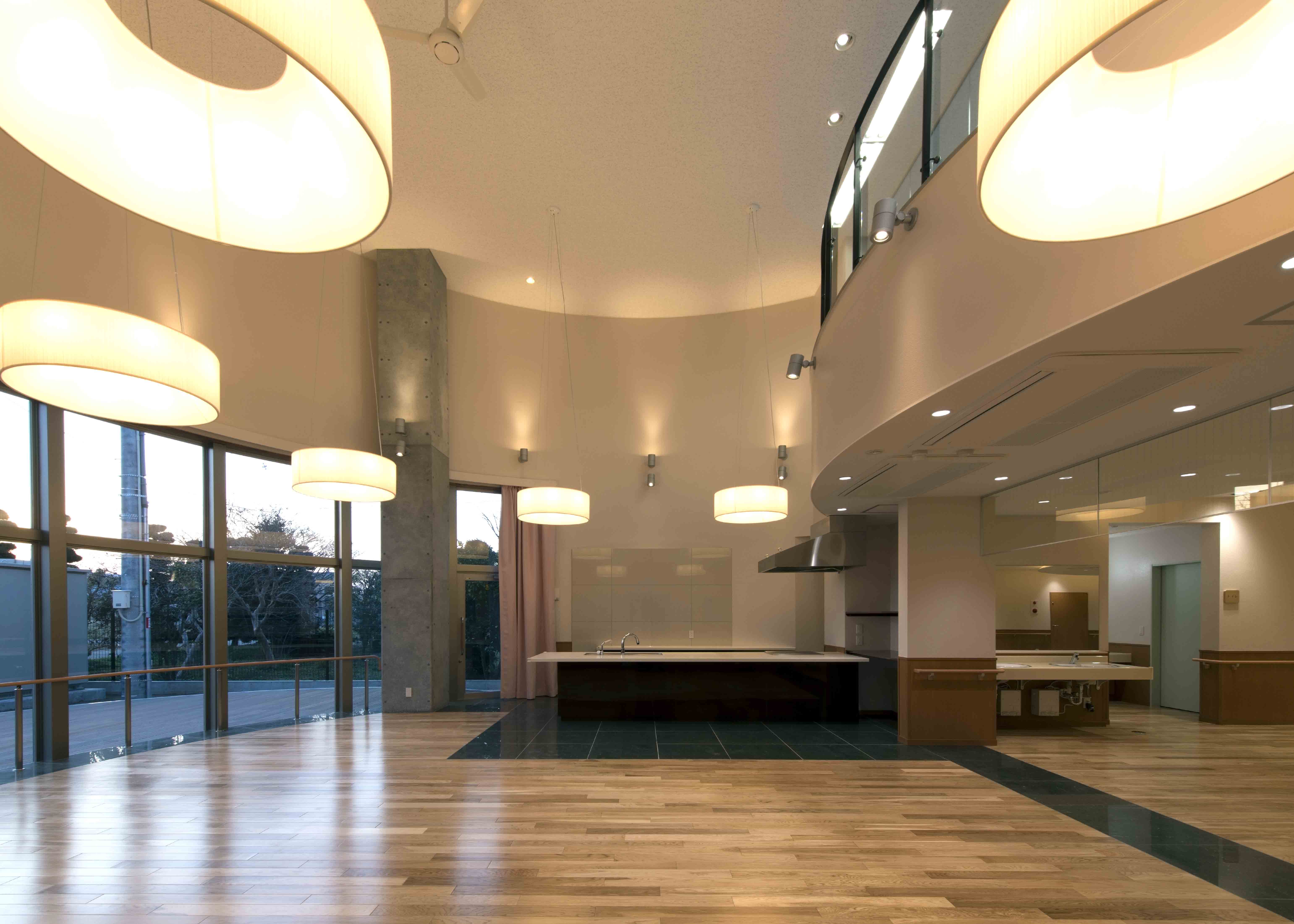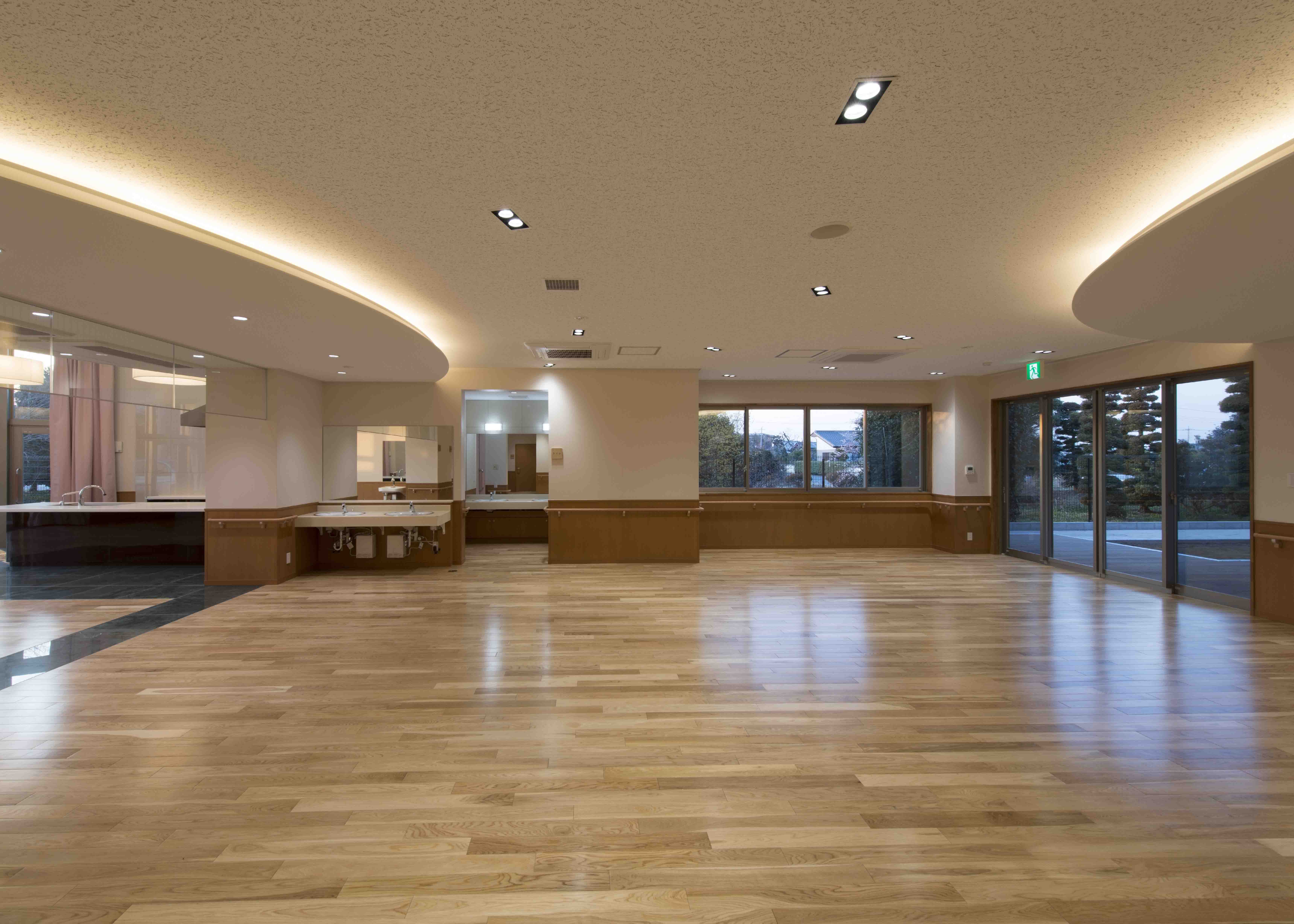 円筒形ホール、円筒形の浴室、円形の休養室造作天井と、3つの円が連続する構成とし、室内空間にメリハリとリズムをもたらし豊かな空間で過ごしてもらうことを考え、利用者の身体的制限に配慮した設計にすることは当然のことながら、施設としてのホスピタリティを有する設計としました。
