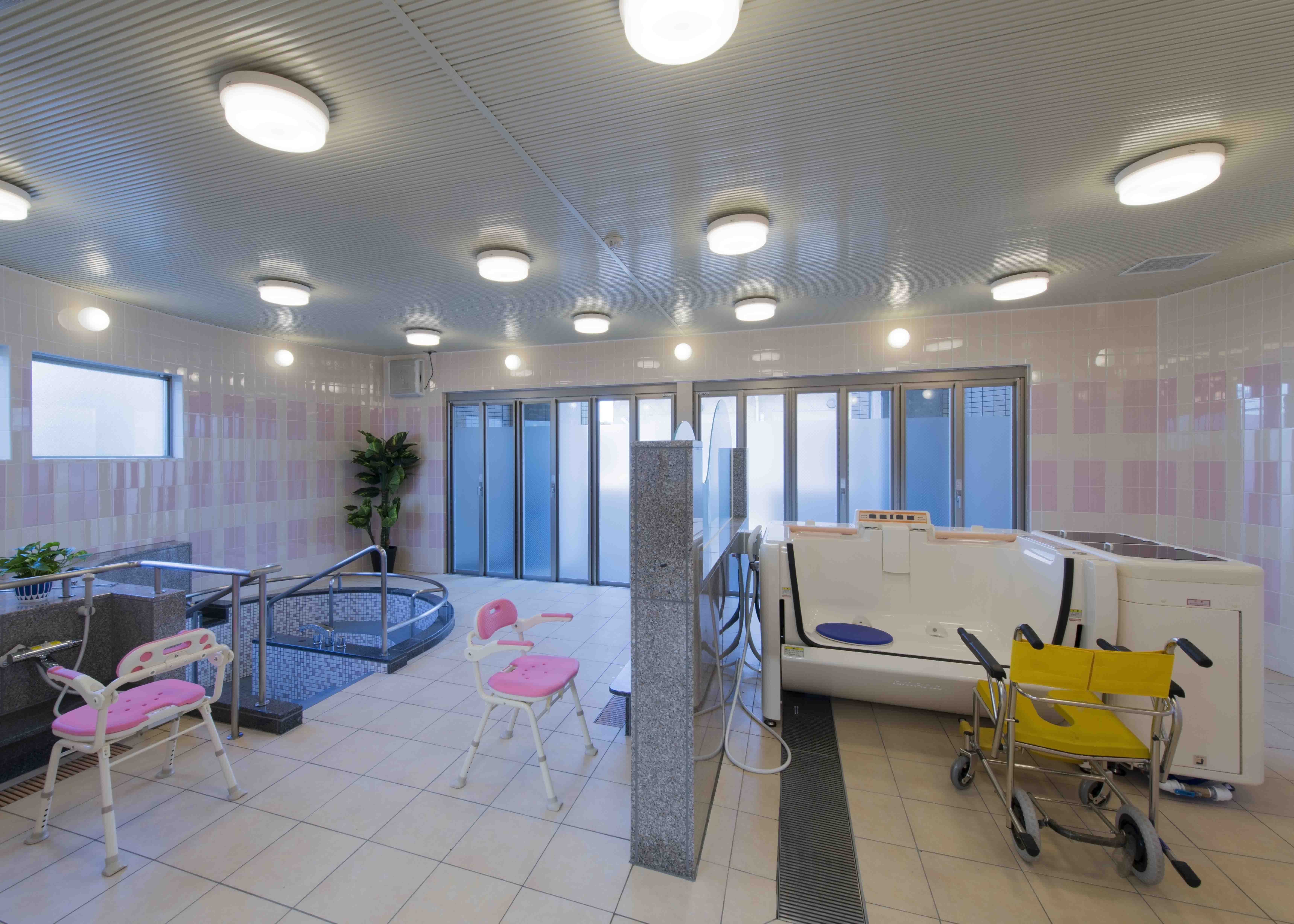 吹抜けになった円筒形ホールは日常的には談話室としての使用を想定し、屋外で過ごすことが心地よい時期にはテラスが使用できるようにしています。またホールでは季節のイベントを開催することを想定し、収容人数が増えても2階からも催し物を鑑賞できようにしています。浴室は独力で入浴できる利用者と機械浴槽の利用者の双方に対応しています。出入り可能な風呂庭に面し、自宅での入浴では味わえない開放感を感じるようにしています。