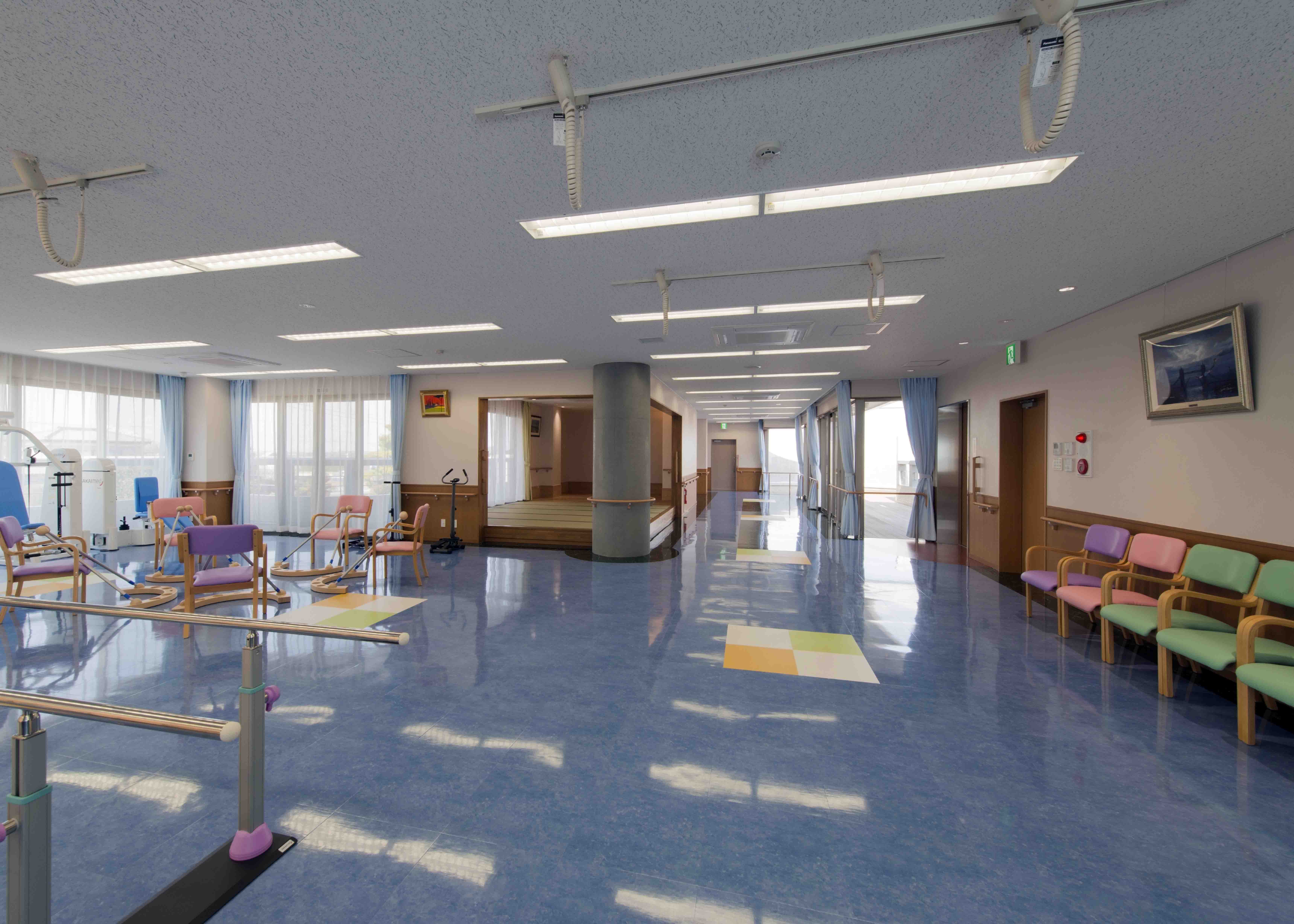 2階のリハビリ室の床の模様は、歩行トレーニング時の歩行距離のガイドになっています。2階のテラスやバルコニーは、利用者が不意に出てしまっても転落事故が絶対に起きないよう腰壁の高さに配慮しています。
