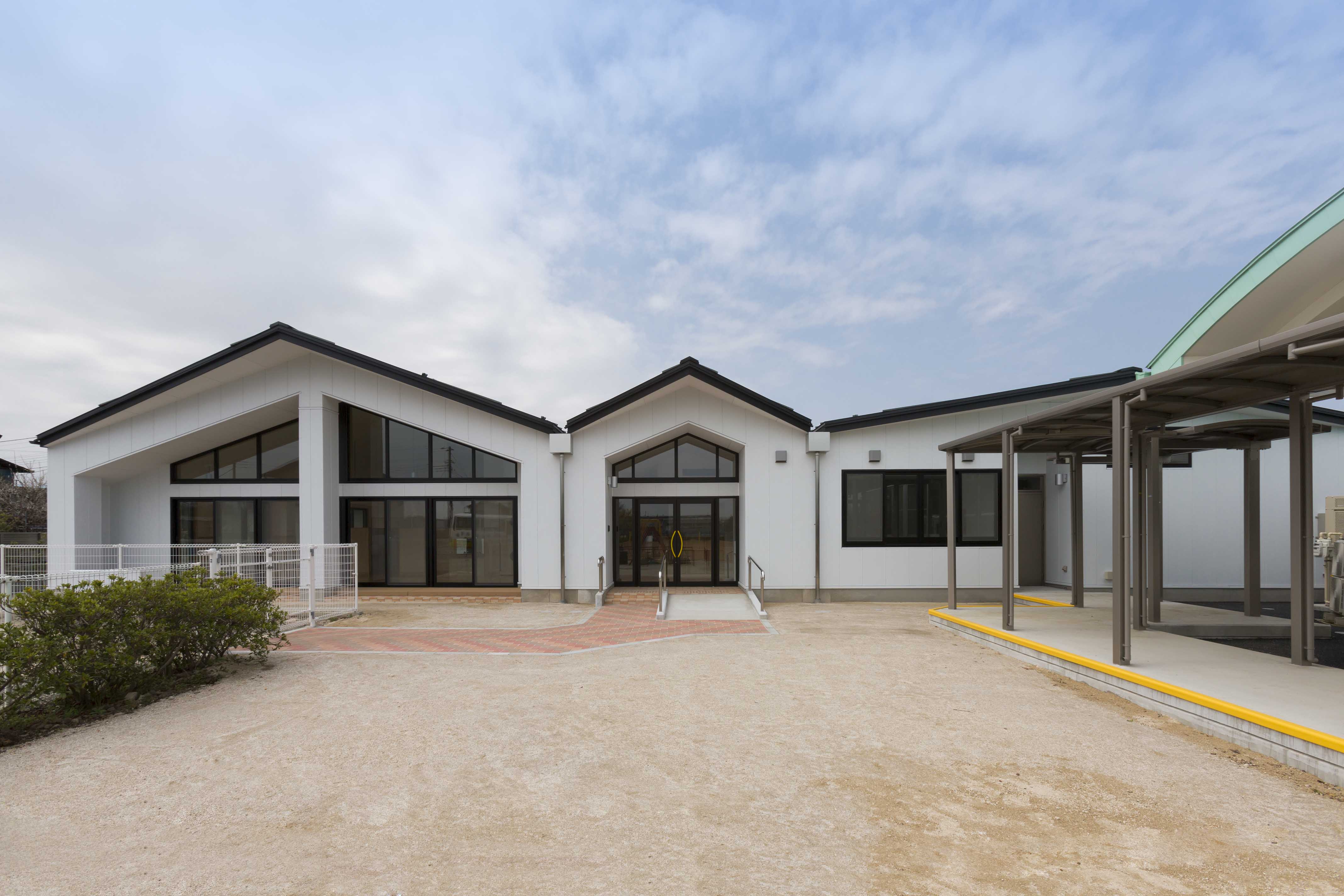 利用者や近隣の方の印象に残り愛着を持ってもらえる園舎を目指しました。保育スペース、共用スペース、事務・給食室スペースそれぞれに切妻屋根をかけ横並びに接続したデザインとしています。3つの屋根と各ゾーンが合致しています。