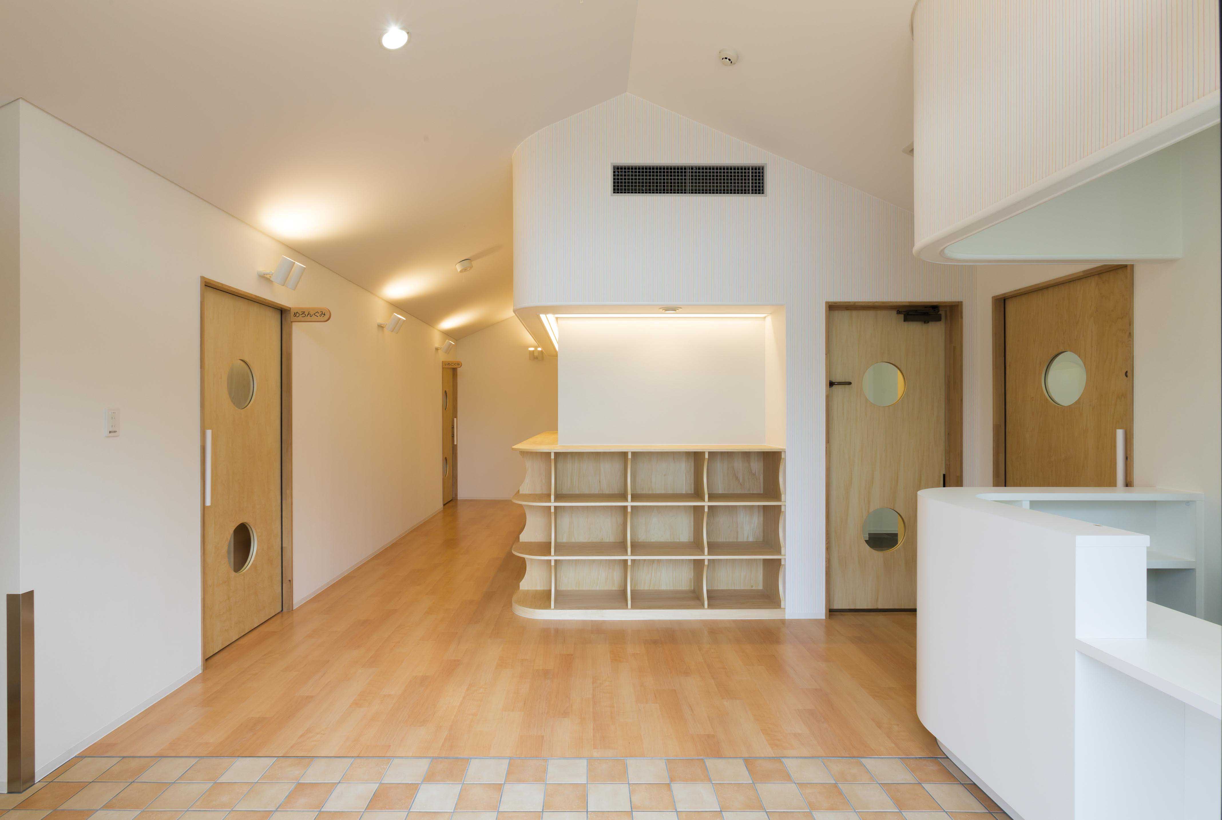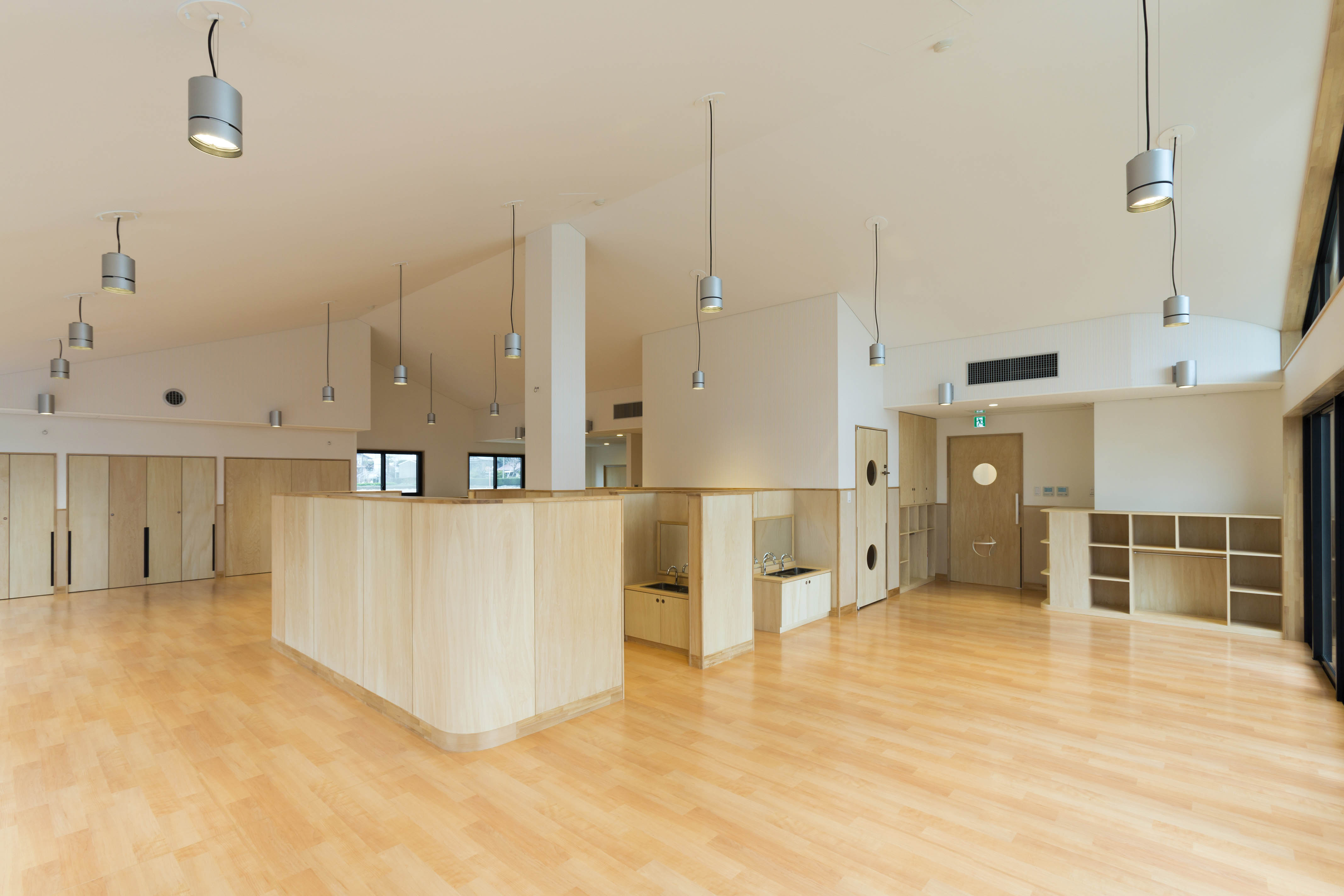 玄関ホールや保育室内の活動スペースは、傾斜天井とし天井高さに変化を持たせ、決して大きくはないですが広々とした印象を持たせるようにしています。逆に保育室内の昼寝スペースは、天井高をグッと下げ落ち着いて就寝できるように配慮しています。