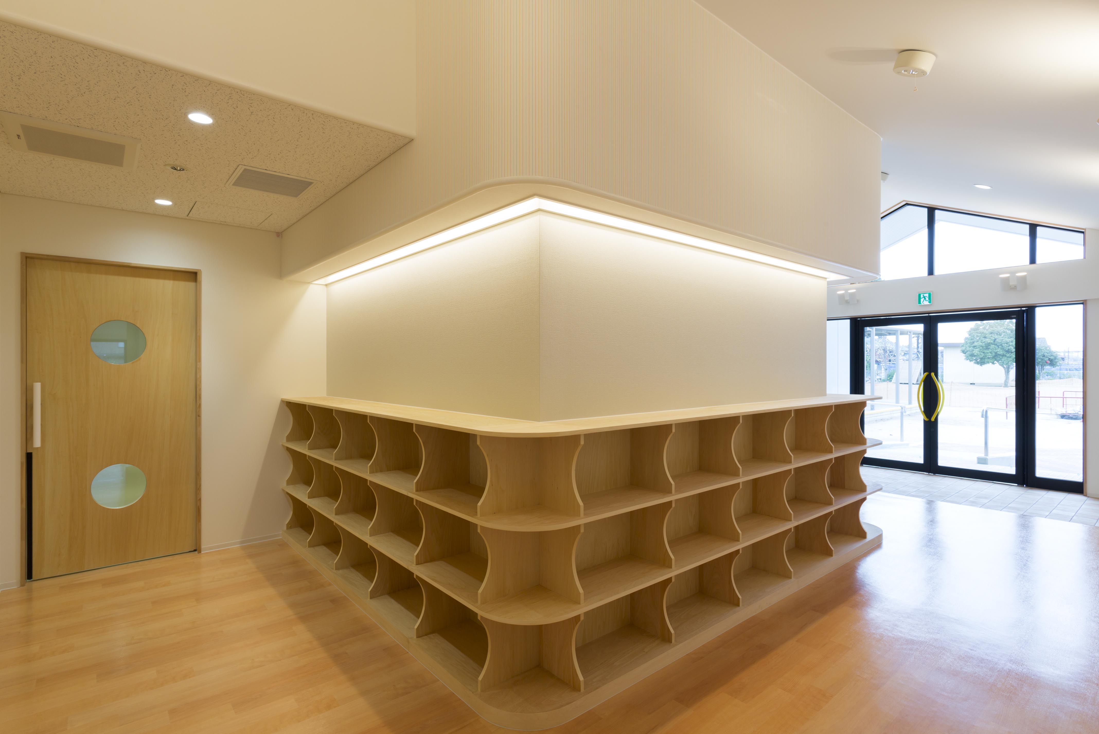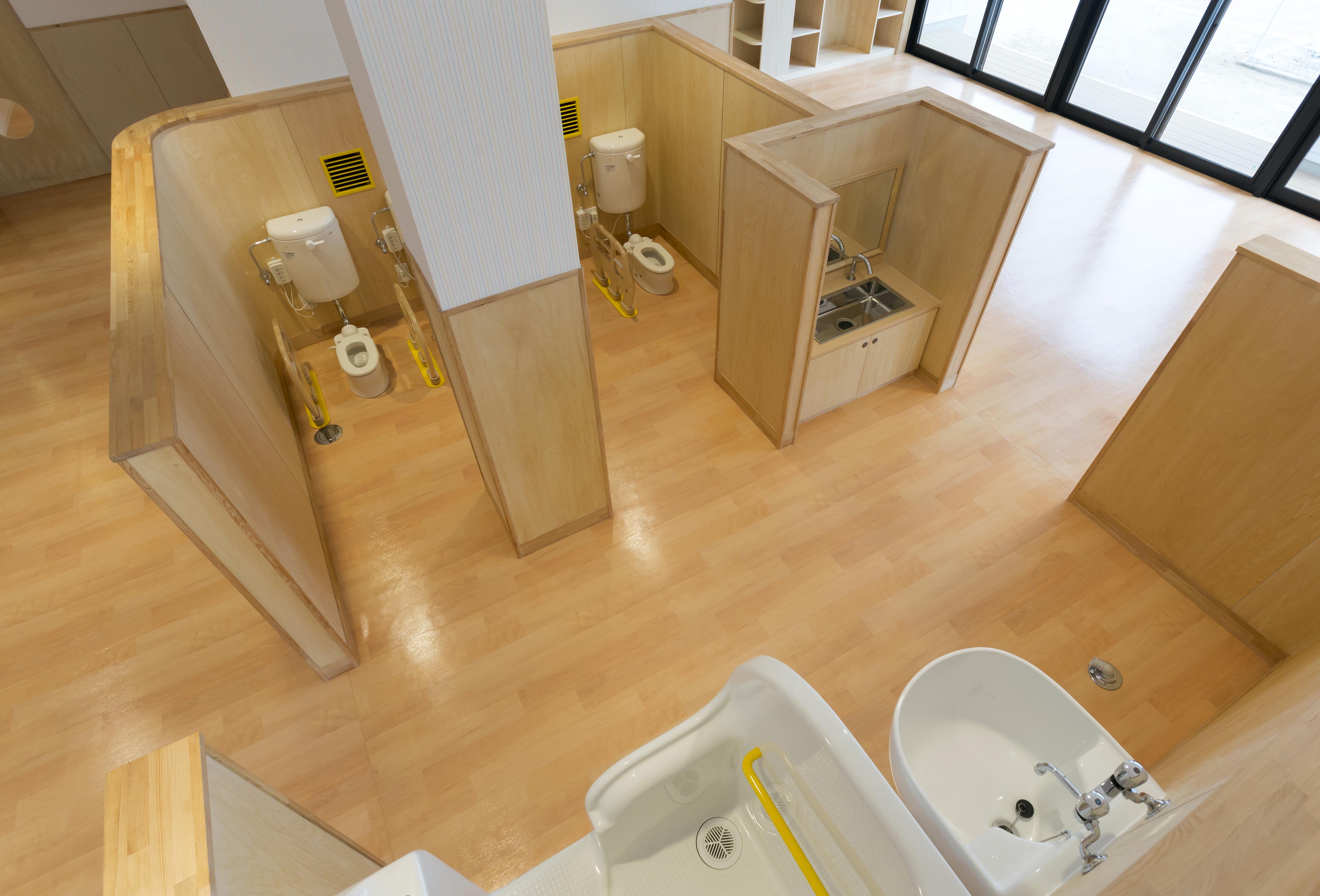 幼児トイレは一般的には隅っこに計画されることが多いですが、あえて保育室中央に配置しました。幼児期における不意な排泄や嘔吐に対し保育士が対応し易く、幼児期の子供たちのトイレトレーニングもスムーズにできる利点があります。トイレと保育室が1室内にあるので、臭気がまわらないよう換気設備の配慮をしています。トイレの囲いは、出入り口をすぼめ、手洗いを必ず使用するように配置して衛生に配慮しています。また囲いの高さは、保育士の女性を想定し、囲いの向こう側とコミュニケーションができる、囲いに近づくと中を覗き込める、少し離れるとトイレを感じさせない高さを検証しながら決定しました。