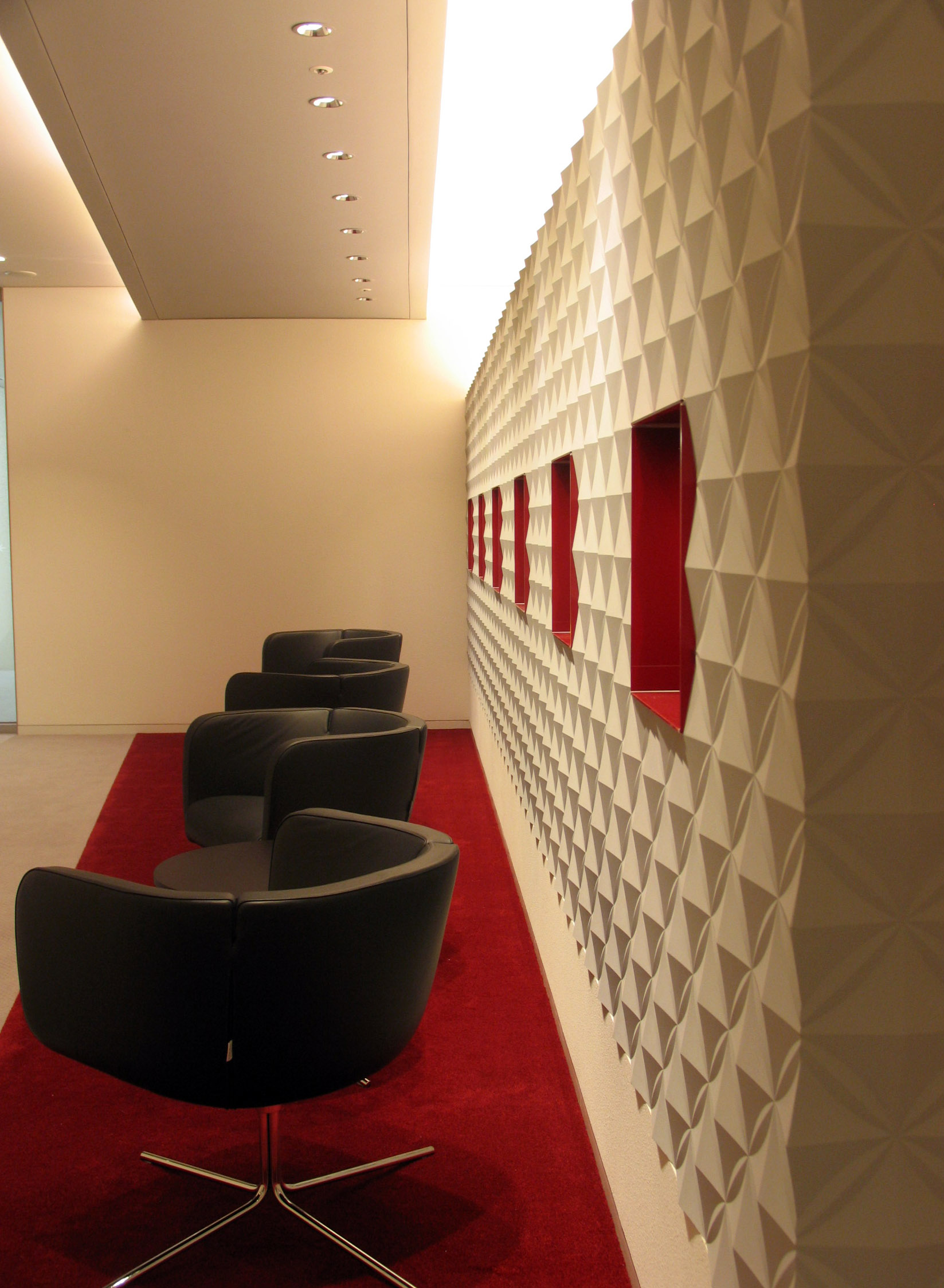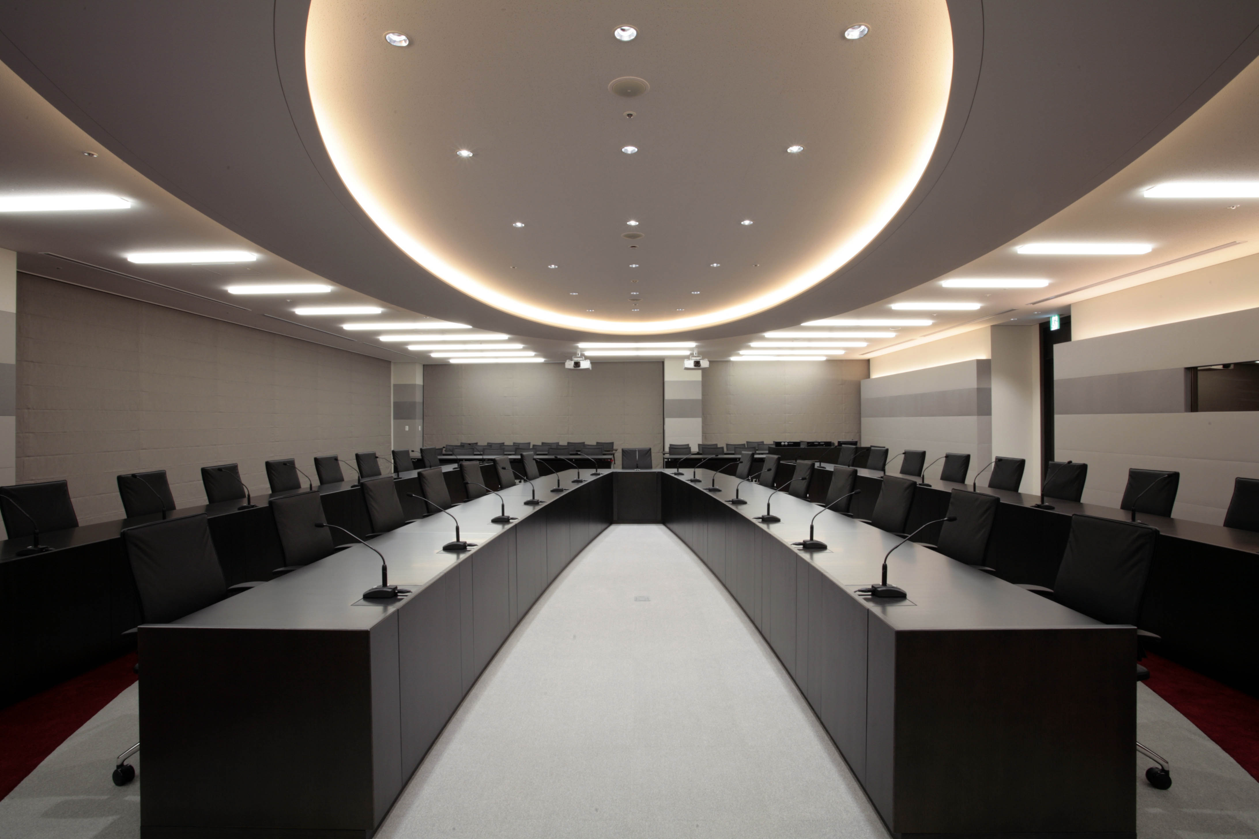 社長をはじめとする会社役員の執務個室や会議室、応接室からなる空間です。モノクロームのベースカラーに、コーポレートカラーである赤色をアクセントに効かせた色彩計画としました。また、コーポレートロゴマークのグラフィックデザインが曲線を用いたものであることになぞらえて、重要会議室の天井と床は楕円曲線が呼応するようなダイナミックなインテリアデザインとしています。