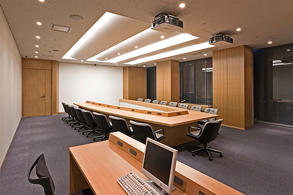 某企業の役員使用エリアのインテリアデザインです。役員会議テーブルは役員の数や席次、会議の流れを考慮し天板形状・大きさを決定し、各席にネットワーク設備・映像音声設備を内蔵したオリジナルテーブルです。