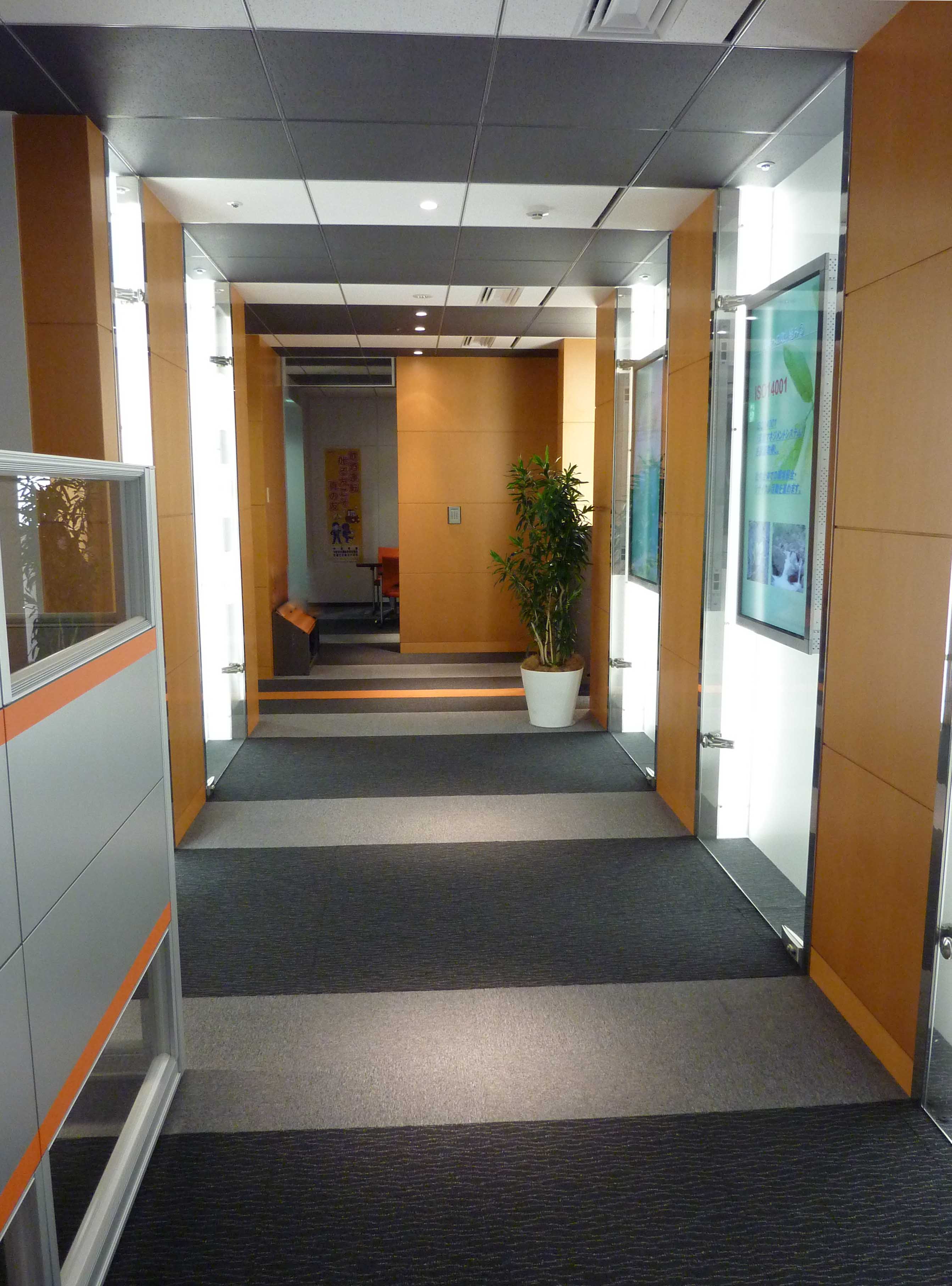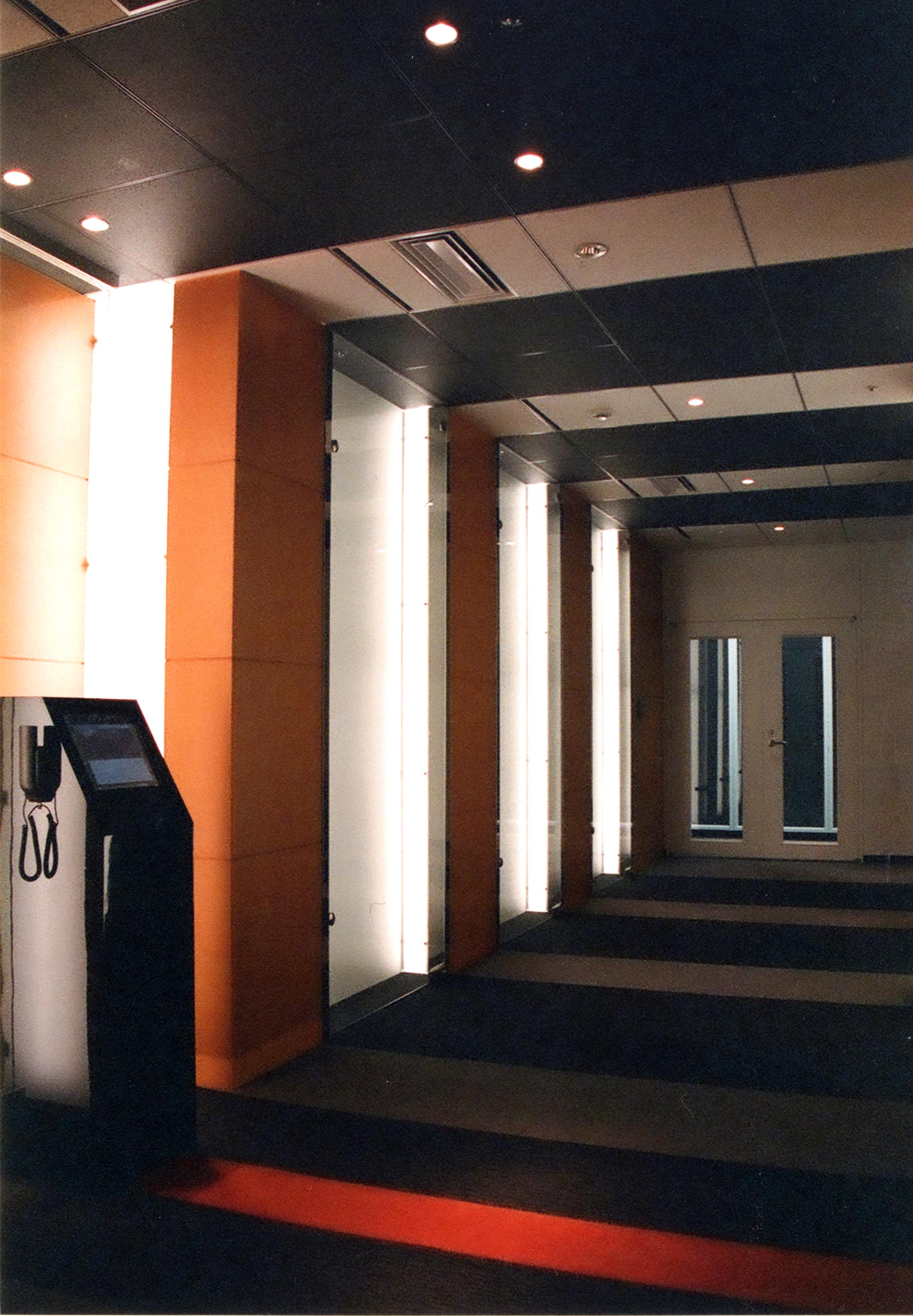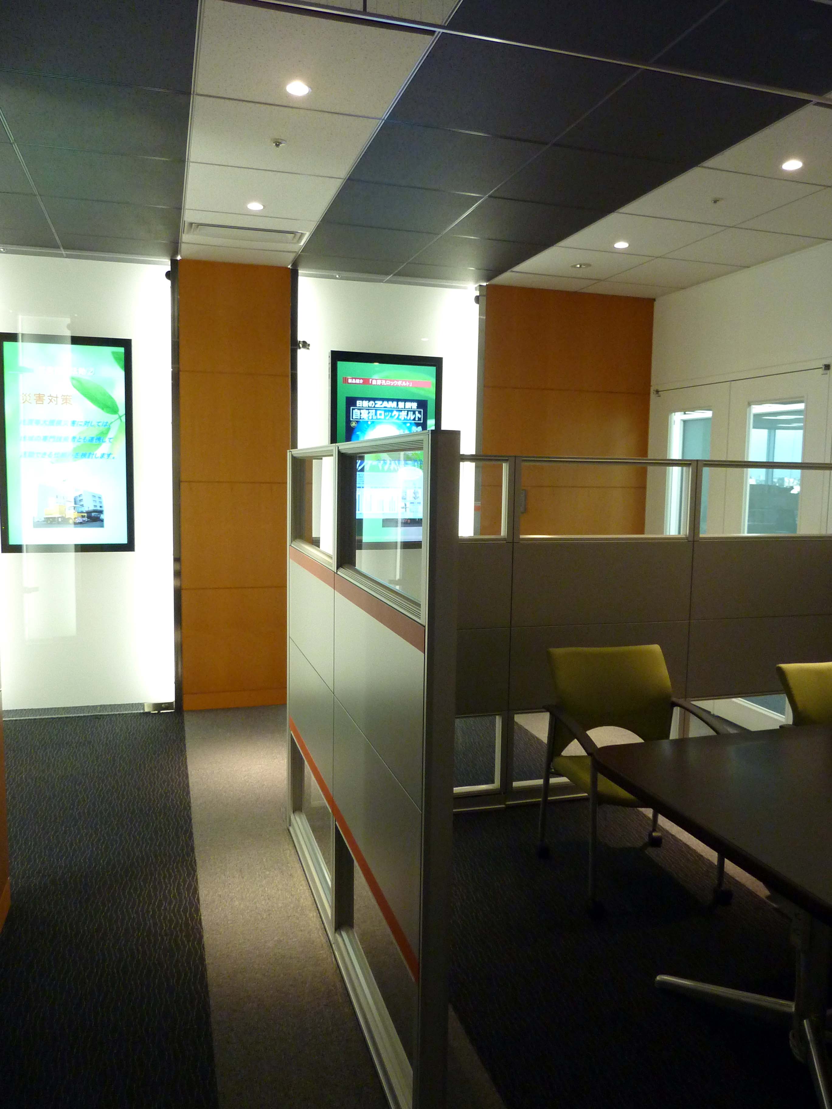 オフィスの受付空間のインテリアデザインです。無人受付スペース、企業活動をアピールするデジタルサイネージ、打合せスペースを、「つながり」をテーマにして表現しています。