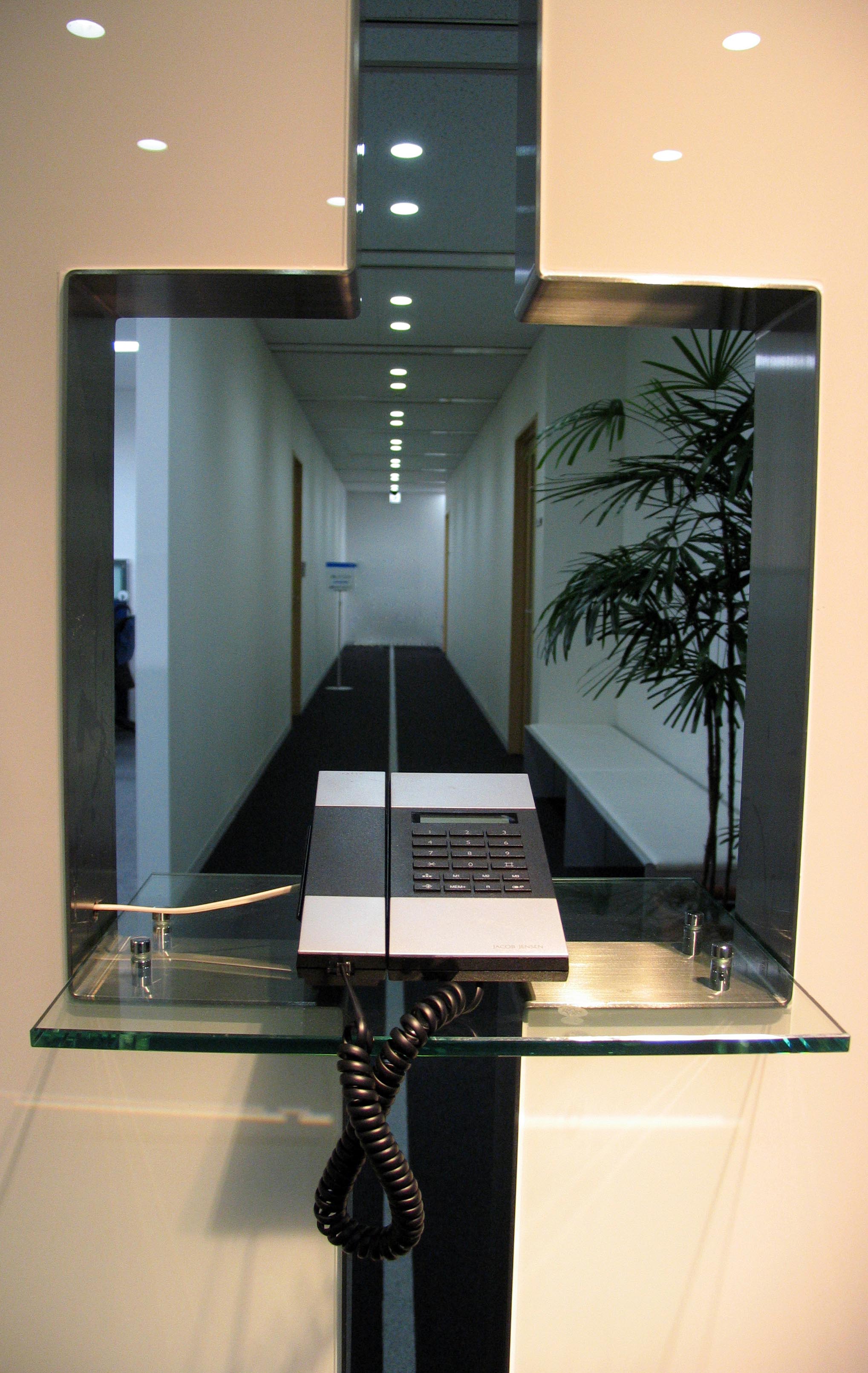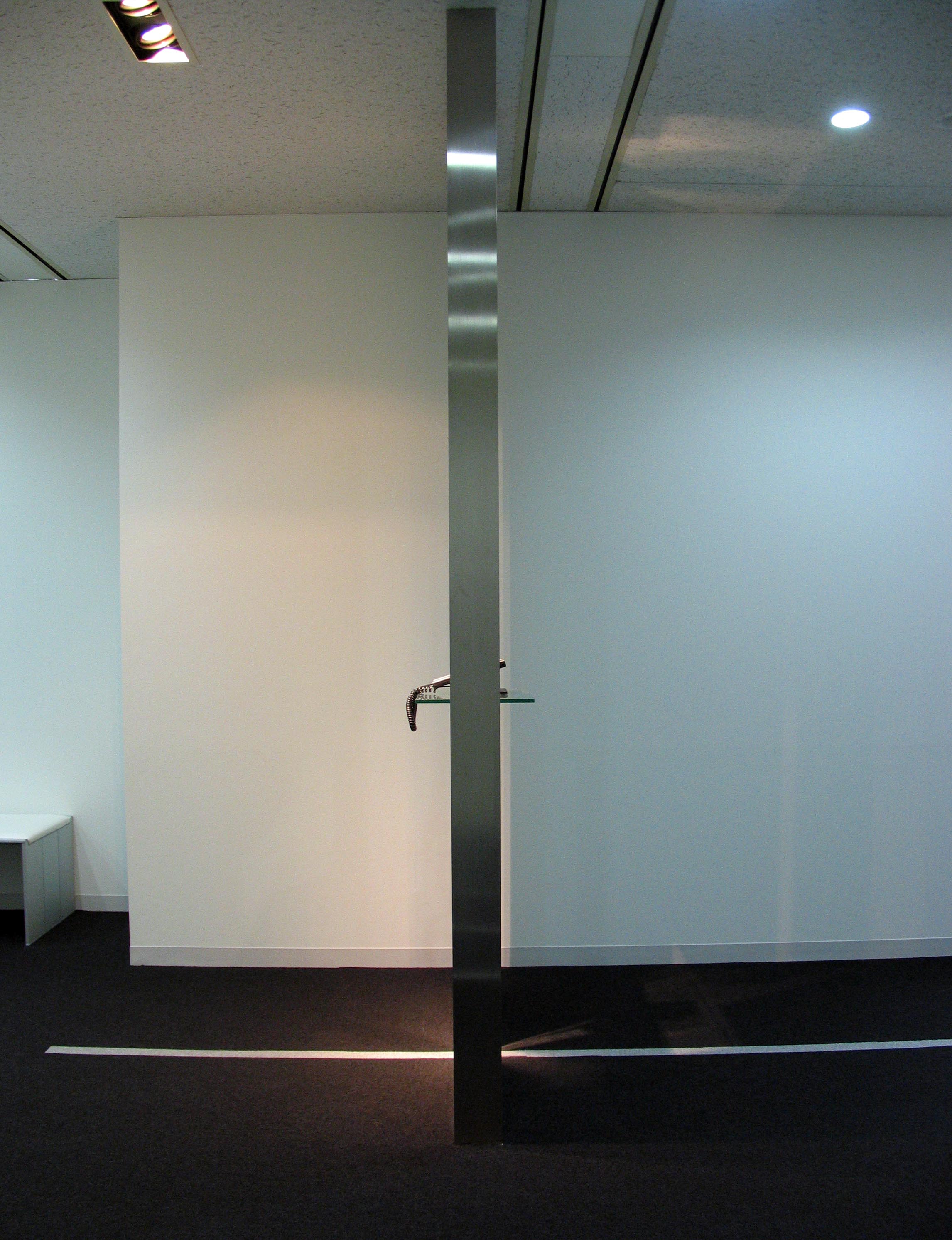 オフィスの無人受付のインテリアデザインです。20メートルある中廊下の奥行感だけをデザインに取り込むため、スリットが入った壁を立て中央に四角い穴を穿ち、見えるものをコントロールした。