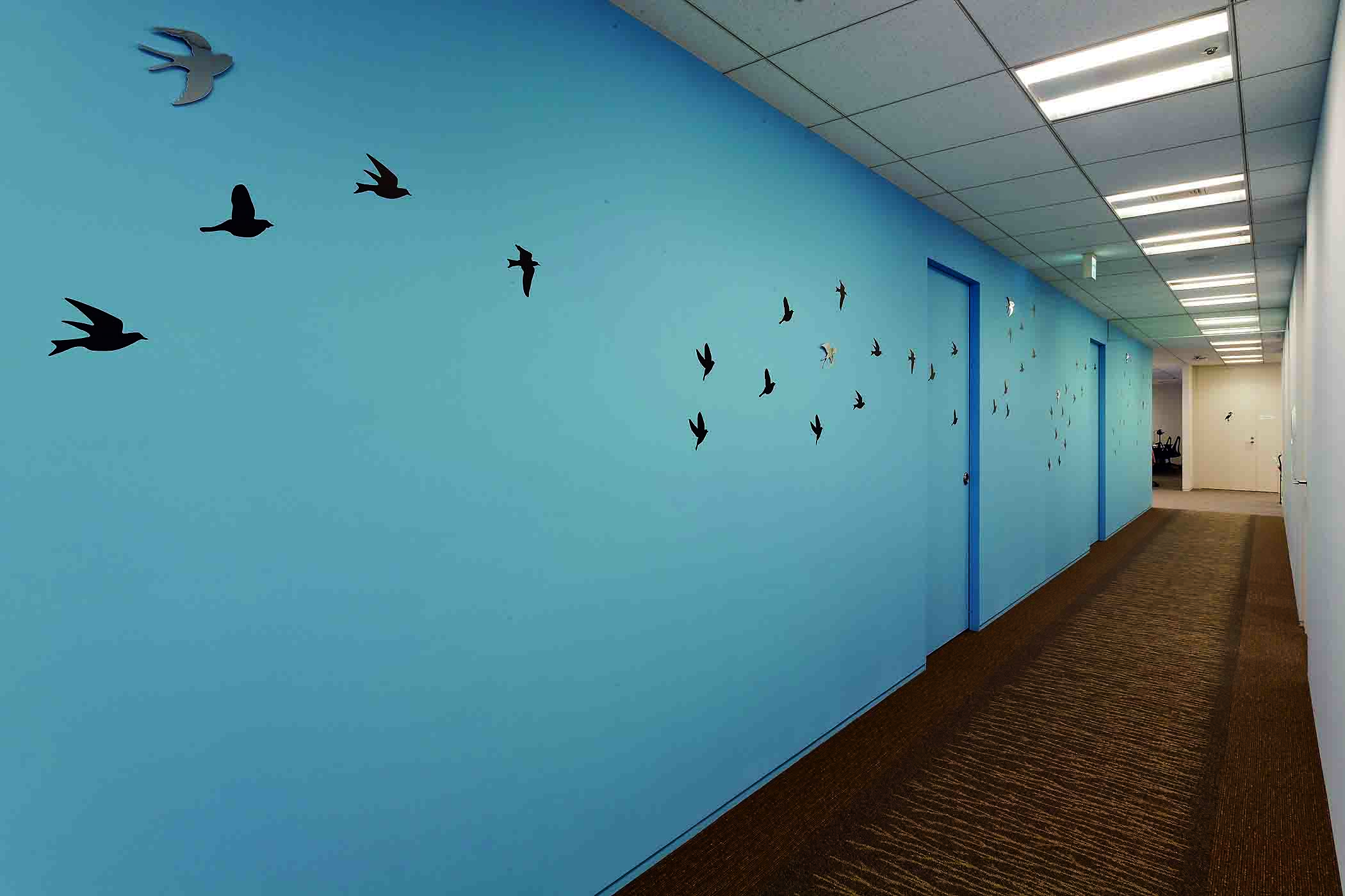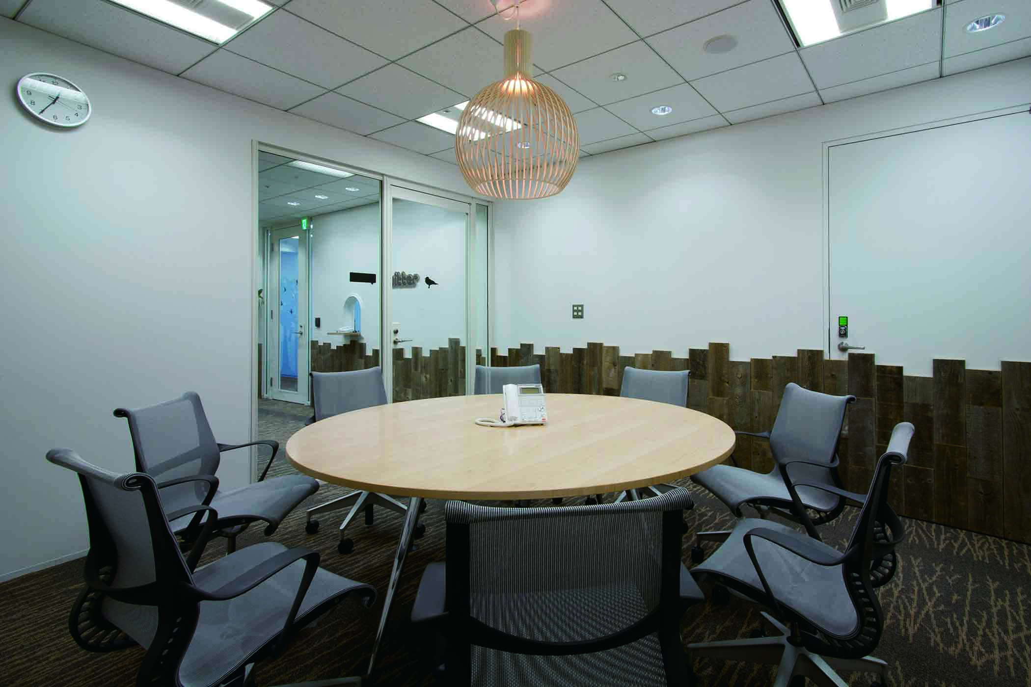 オフィスのインテリアデザインです。企業のアイコンである鳥を想起するインテリアデザインを各所に取り入れることで、オフィス空間に企業のアイデンティティを感じられるように考慮しています。