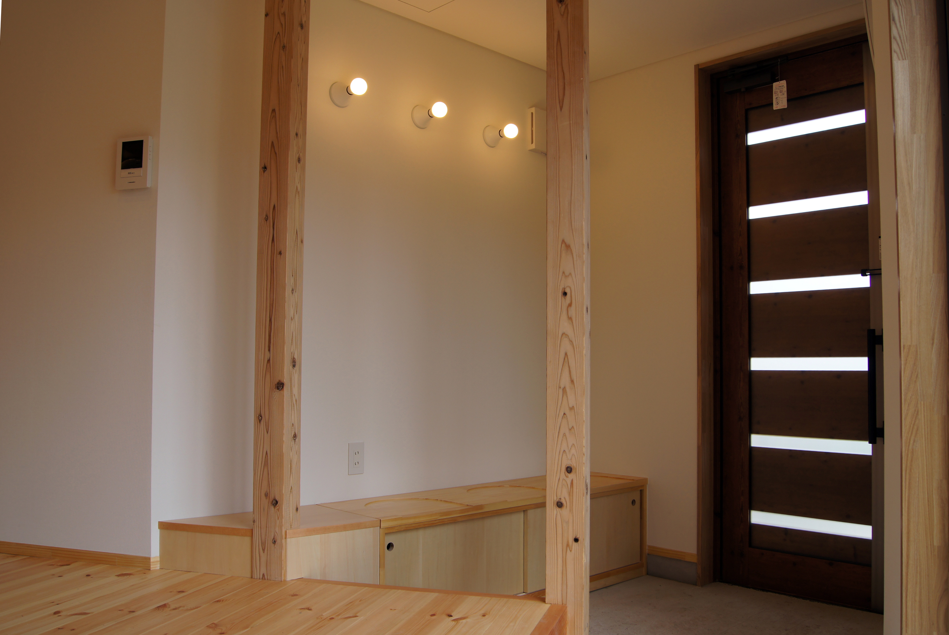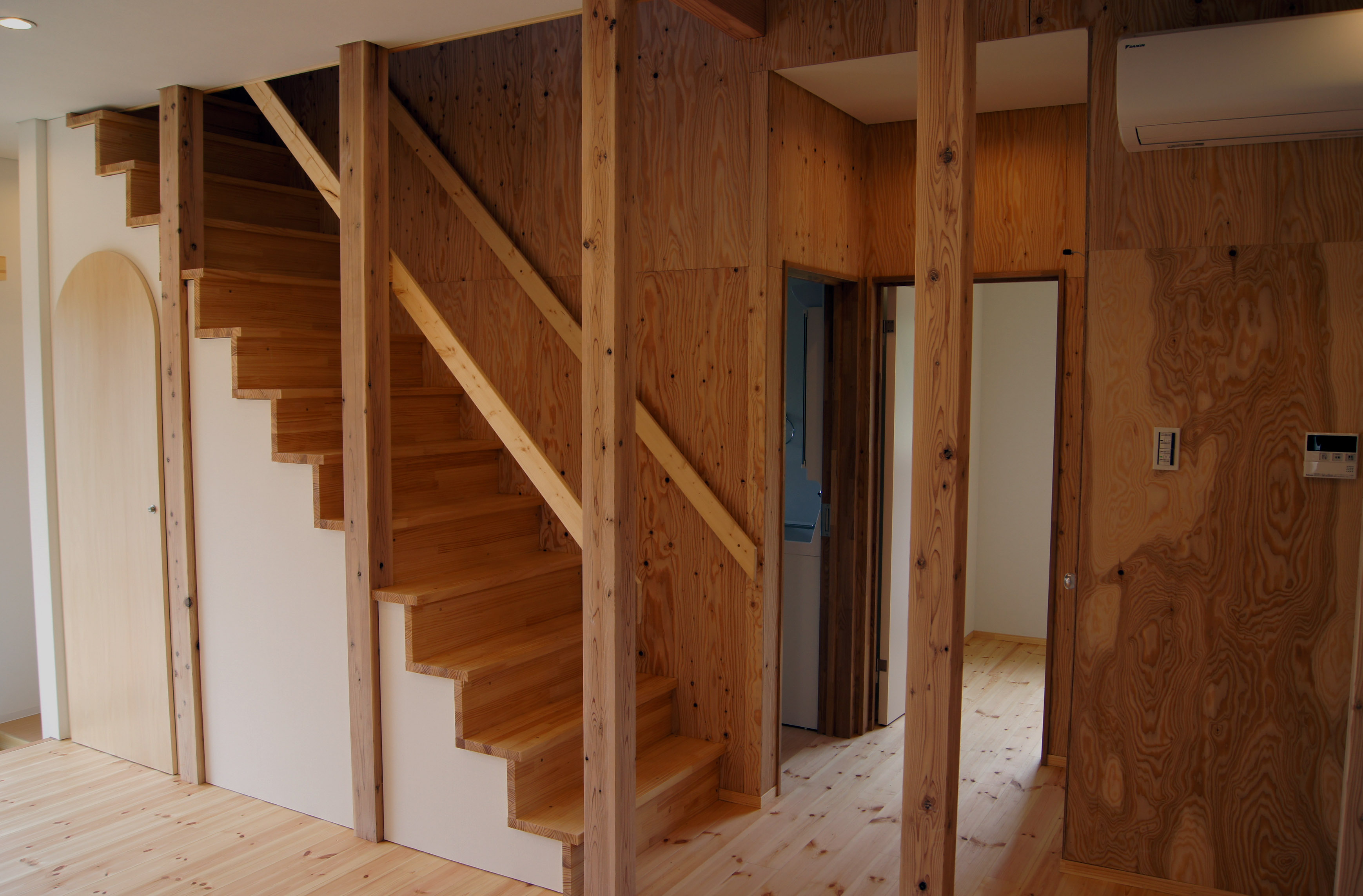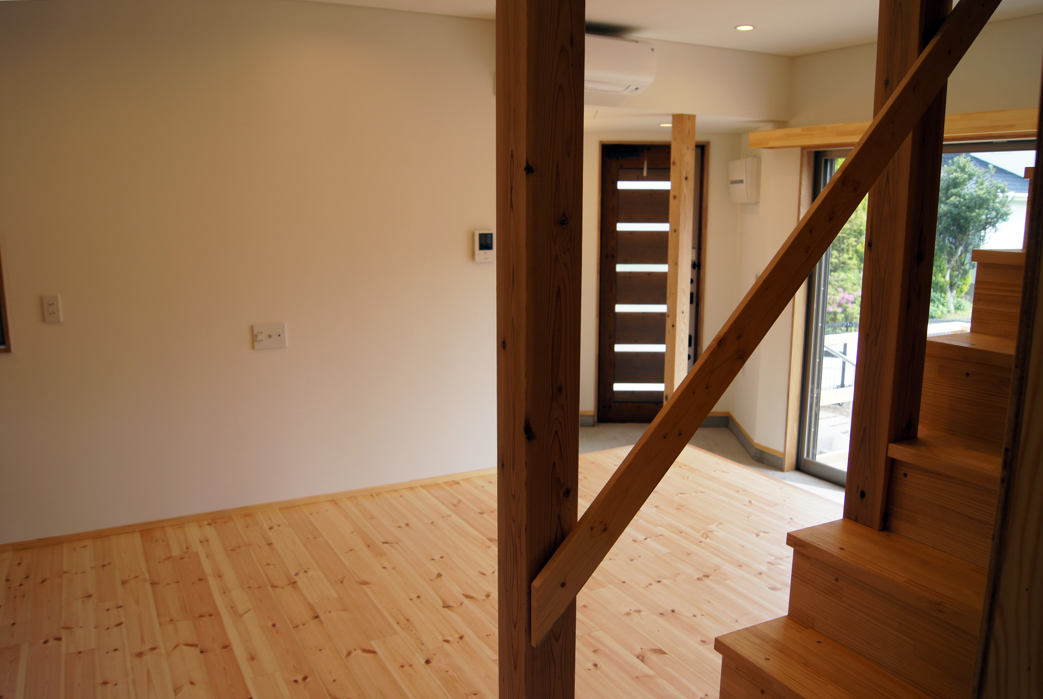 大寝室とは別の寝室や、犬たちを洗う部屋と、必要な部屋が一般的な別荘より多く求められ、また建築予算の兼ね合いもあり、本来はゆったりとしたスペースを取りたいリビングダイニングスペースをコンパクトにまとめざるを得ませんでした。そこで、できるだけリビングダイニングスペースを大きく感じさせるため、玄関を下屋で計画し、その下屋をリビングダイニングスペースの角に対角線上に配置しました。最も奥行が大きい対角線方向の動線及び視線軸をつくることで、四角形の部屋の対角線を奥行として認識し易くなり、空間の狭さを感じづらくしています。