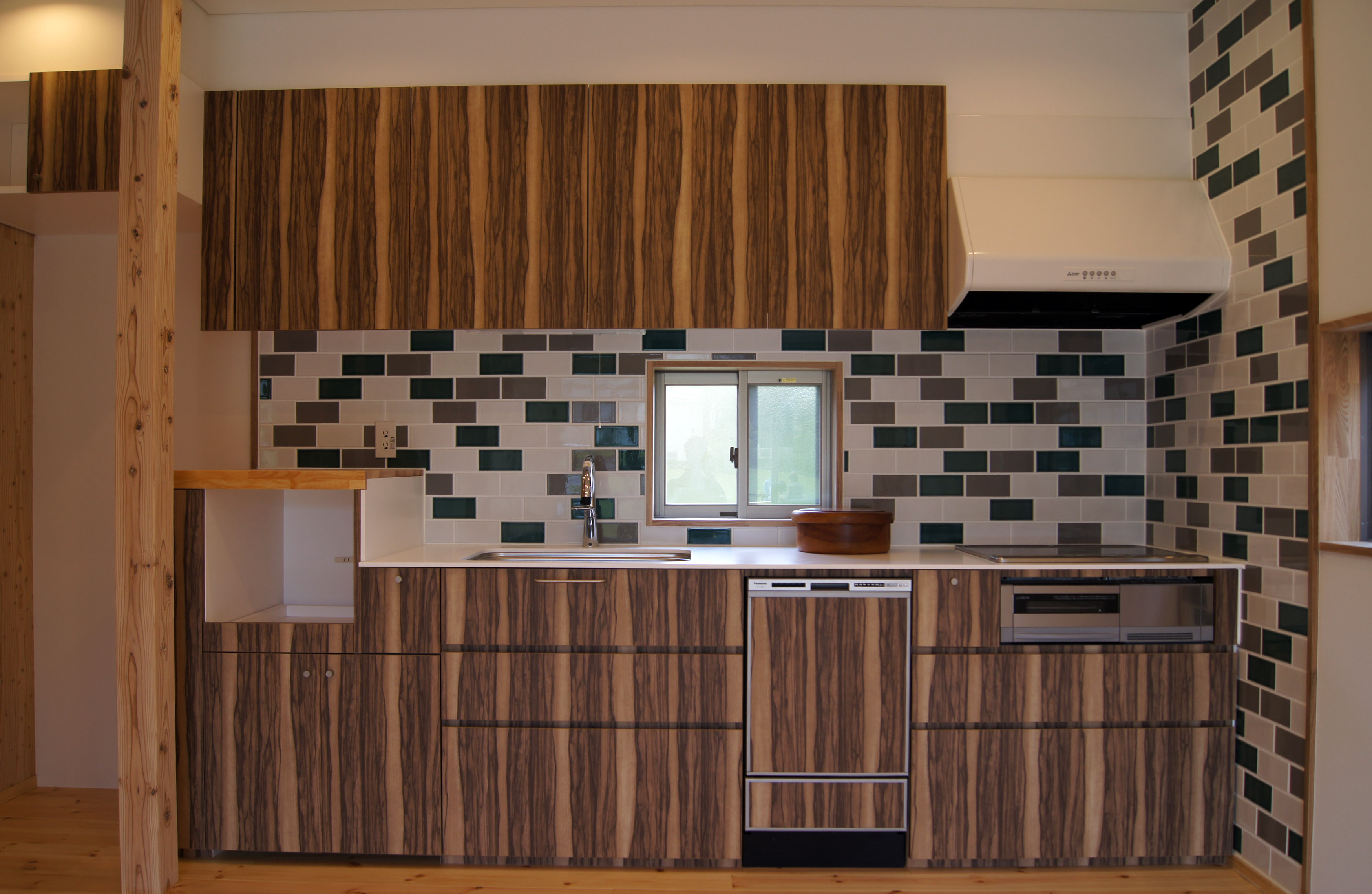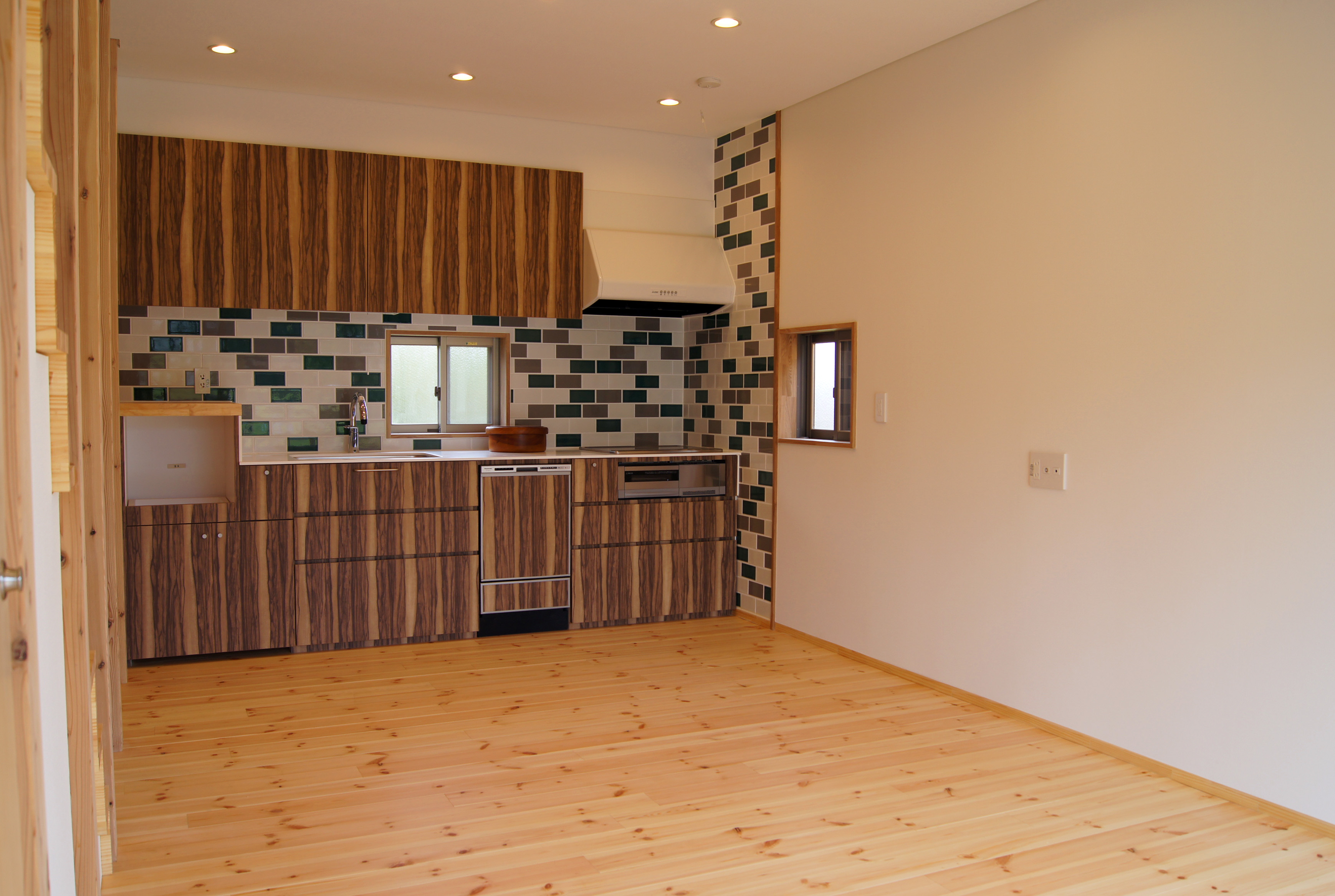 また、リビングの一部の床のレベルを下げて土間としています。これは外遊びから帰ってきた犬たちが土間を経由して直接ドッグバスがある部屋にアクセスできる事と、ウッドデッキテラスを第2のリビングルームとして使用してもらう事を考えて計画しました。温暖な気候であるこの地区で過ごすには、ドッグランたる広い庭を有する外で及び外向きに過ごす事が快適なはず。リビング内の土間の框の段差は、腰掛けるのに丁度良く段差を上がるのに苦労しない30㎝としているので、デッキをリビングとして使用する際には腰かける椅子になり、インドア/アウトドアのボーダーを超えて使えます。土間床は、夏季には周囲より表面温度が低いので、犬たちには絶好の避熱スポットになるはずです。